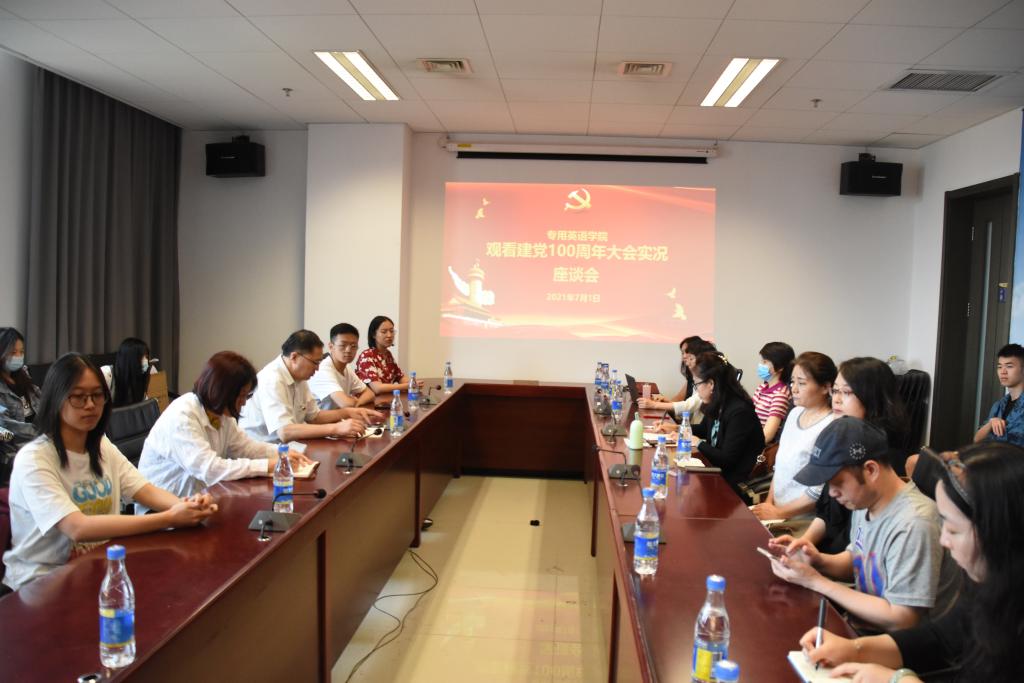 7月1日上午10点,太阳成集团tyc234cc党总支组织全体师生党员、入党积极分子和各班学生在国际大厦礼堂集体观看了庆祝中国共产党成立100周年大会直播,并在直播后召集师生党员和同学代表共计30多人在国际大厦1016召开座谈会。座谈会由党总支书记蔡鸿主持。